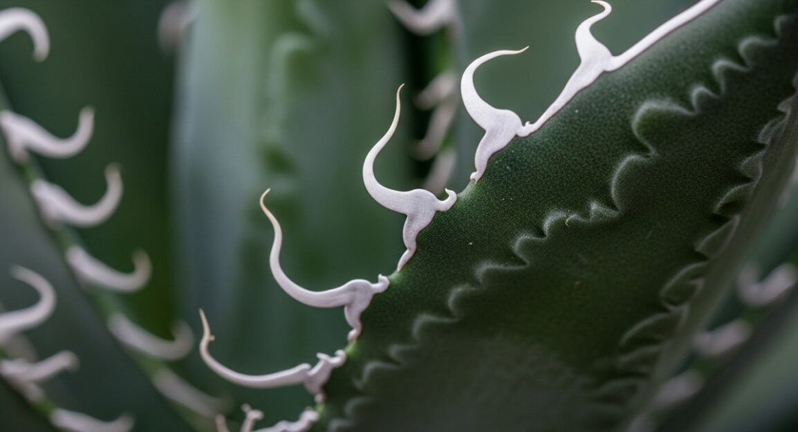 アガベ シジゲラの最大の見どころといえば、なんといっても葉の縁からクルリと巻くように現れる「白い糸」ですよね。初めて見た時は「誰かが糸を巻きつけたの?」なんて驚く方もいるかもしれませんが、これは植物学的にフィラメントと呼ばれている立派な体の一部です。