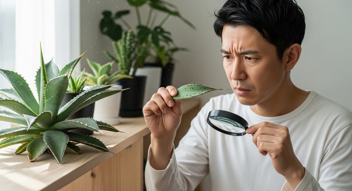 せっかく大切に育てているアガベの葉に、ある日突然茶褐色の斑点が現れたらショックですよね。